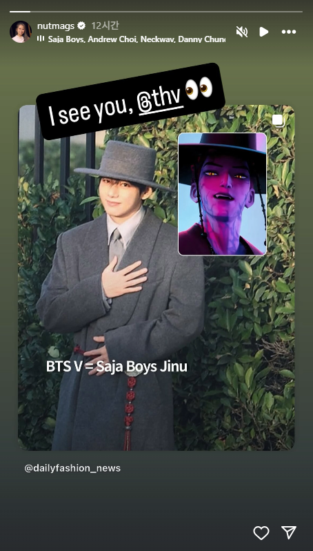 '케이팝 데몬 헌터스'(KPop Demon Hunters)의 메기 강 감독이 27일(현지시간) 자신의 사회관계망서비스(SNS)에 뷔의 패션이 사자보이즈 진우와 유사하다고 언급했다. 메기 강 인스타그램·데일리패션뉴스 해당 사진을 본 넷플릭스 '케이팝 데몬 헌터스'(KPop Demon Hunters)의 메기 강 감독은 작품 속 사자보이즈의 진우와 뷔의 사진을 나란히 배치하고 "I see you @thv, BTS V=Saja Boys Jinu(사자보이즈 진우)"라고 쓴 게시물을 자신의 사회관계망서비스(SNS)에 게시했다. 한편, 뷔는 지난 달 17일 PH129(더펜트하우스 청담) 전용 면적 273.96㎡를 142억원 전액 현금으로 매입하며 청담동 초고급 주택 보유자가 됐다.