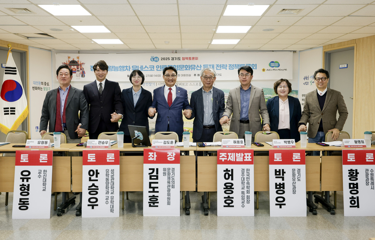 27일 수원시 팔달구청 대회의실에서 열린 ‘정조대왕능행차 유네스코 인류무형문화유산 등재 전략 정책토론회’에서 참석자들이 기념촬영을 하고 있다. 화성시 제공 앞서 지난 4월에는 경기도와 수원·화성시가 협업하는 관련 용역이 발주됐다. 연말까지 이어지는 용역에선 그동안 수원·화성 등 기초지자체가 산발적으로 진행해 온 무형유산 등재 계획을 체계적으로 정리하게 된다. 국내에선 2001년 ‘종묘제례 및 종묘제례악’을 시작으로 지난해 말 ‘장(醬) 담그기 문화’까지 23건이 유네스코 인류무형문화유산 목록에 올라 있다. 1997년 수원화성의 유네스코 세계유산 등재 역시 지자체 간 공조로 가능했다.