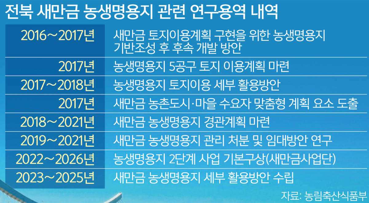 농림축산식품부가 10년 넘게 새만금 농생명용지 조성 사업을 추진하면서 다수의 연구용역을 진행했지만, 구체적인 사업 성과는 여전히 미미한 것으로 나타났다.