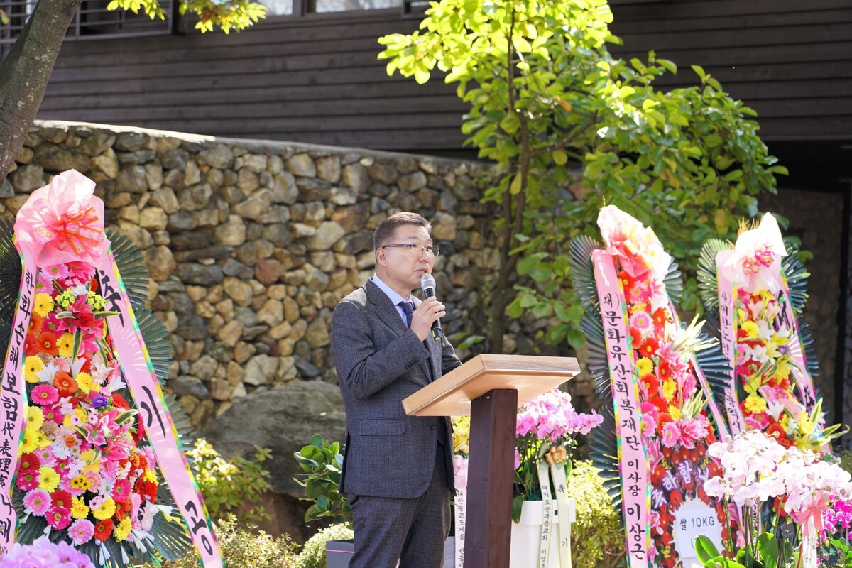 지난 28일 인천 강화군 강화도우리마을에서 열린 발달장애노인 그룹홈 ‘시몬의집’ 기공식에서 풀무원 이우봉 총괄CEO가 참석자들에게 인사말을 전하고 있다. 풀무원은 2011년 강화도우리마을과 MOU를 체결한 이후 발달장애인의 자립과 일자리 창출을 위한 다양한 지원을 지속해 오고 있다. 콩나물 재배 노하우를 전수하고, 친환경 콩나물의 생산·유통·판매를 지원하는 한편 임직원 봉사활동, 식품 기부, 후원 등 꾸준한 교류를 이어왔다.