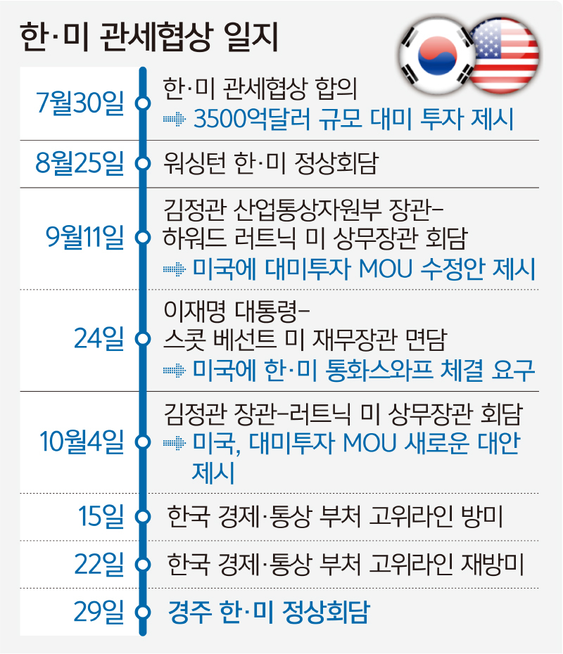 한국 정부는 3500억달러 규모의 대미 투자 패키지와 관련, 트럼프 대통령이 현금·선불 투자를 고수하면서 실무 협의 진전이 어렵다는 분석이 나온 만큼, 이날 이 대통령과의 정상회담에서 ‘톱다운 방식’의 타결이 이뤄질 수 있을 것이란 관측도 나왔으나 협상 과정에서 진통을 이어간 것으로 알려졌다.