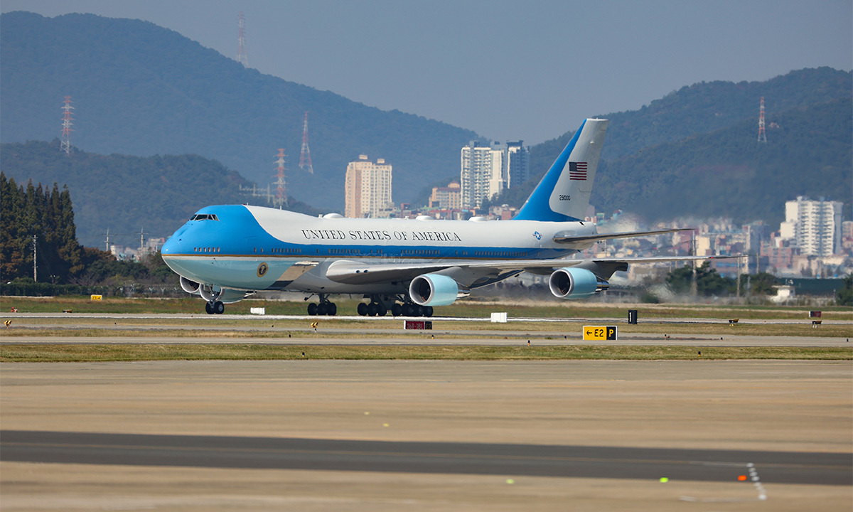 29일 국빈 방한한 도널드 트럼프 미국 대통령의 전용기 에어포스원이 부산 김해국제공항에 착륙하고 있다. 연합뉴스