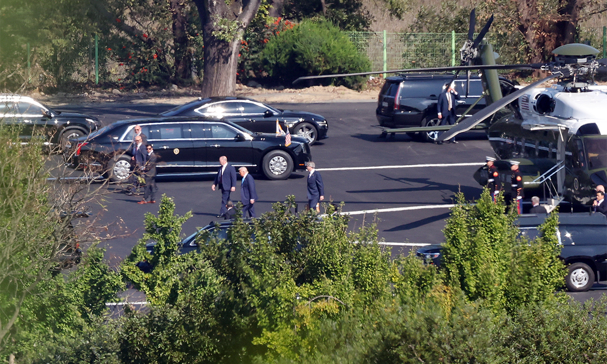 도널드 트럼프 미국 대통령이 29일 전용 헬기 ‘마린원’을 타고 경북 경주 보문관광단지 헬기장에 도착한 뒤 전용 리무진 ‘더 비스트’로 갈아타기 위해 이동하고 있다. 연합뉴스 ◆황금빛 넥타이로 환대한 李 한·미 양국의 이목이 쏠린 정상회담은 역사적 상징성을 지닌 국립경주박물관에서 진행됐다. 황금빛 넥타이 차림의 이재명 대통령은 전통 취타대의 선도·호위 속에서 입장하는 트럼프 대통령을 국립경주박물관 천년미소관 앞에서 맞이했다. 이 대통령의 황금빛 넥타이는 황금색을 좋아하는 트럼프 대통령의 취향을 반영해 특별 제작된 것으로, 훈민정음 문양도 새겼다.