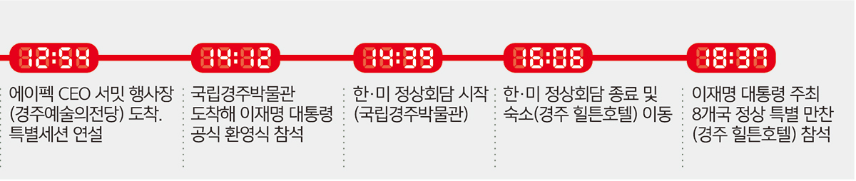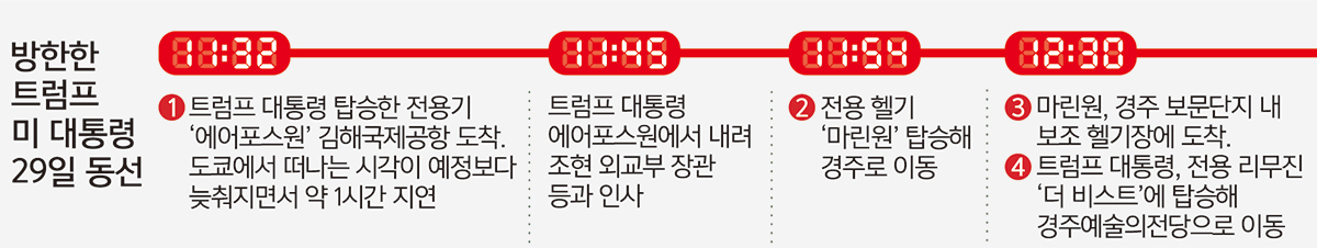 트럼프 대통령 취향에 맞춘 의전은 김해공항에서부터 시작됐다. 21발의 예포 발사와 더불어 군악대는 트럼프 대통령의 대선 유세에서 활용된 1970년대 히트곡 ‘YMCA’를 연주했다. 트럼프 대통령은 김해공항에서 미국 대통령 전용헬기 ‘마린원’을 타고 경주로 이동했다. 곧이어 경주 보문단지 내 헬기장에 도착한 트럼프 대통령은 전용 리무진 ‘더 비스트’에 옮겨탄 뒤 ‘에이펙 최고경영자(CEO) 서밋’이 열린 경주예술의전당에서 특별 연설을 했다.
