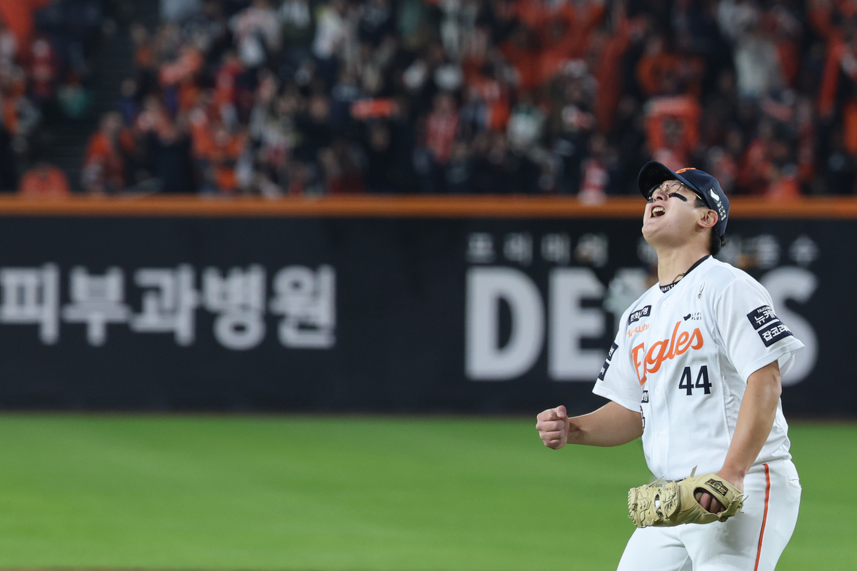 29일 대전 한화생명볼파크에서 열린 프로야구 2025 신한 SOL뱅크 KBO 포스트시즌 한국시리즈 3차전 LG 트윈스와 한화 이글스의 경기, 한화 김서현이 LG에 7대3 역전승을 거둔 뒤 포효하고 있다. 뉴스1