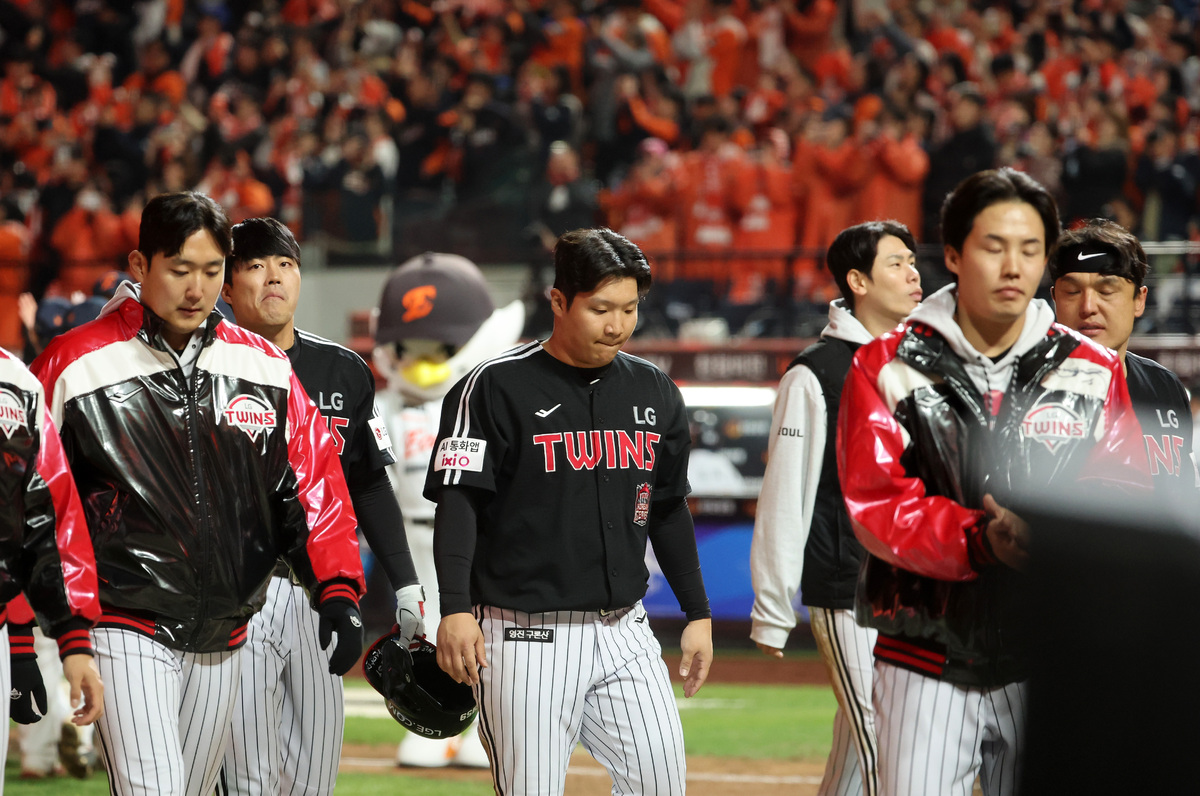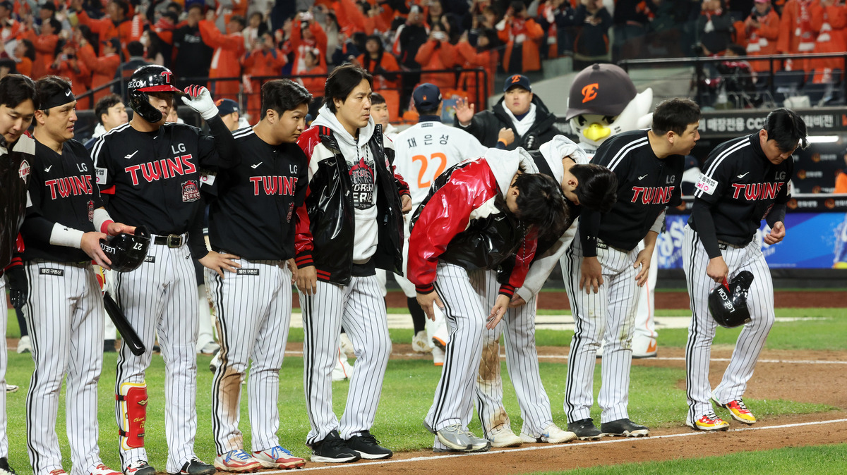 29일 대전한화생명볼파크에서 열린 2025 프로야구 KBO리그 포스트시즌 한국시리즈 3차전 LG 트윈스와 한화 이글스의 경기에서 패배한 LG 선수들이 관중에게 인사하고 있다. 연합뉴스