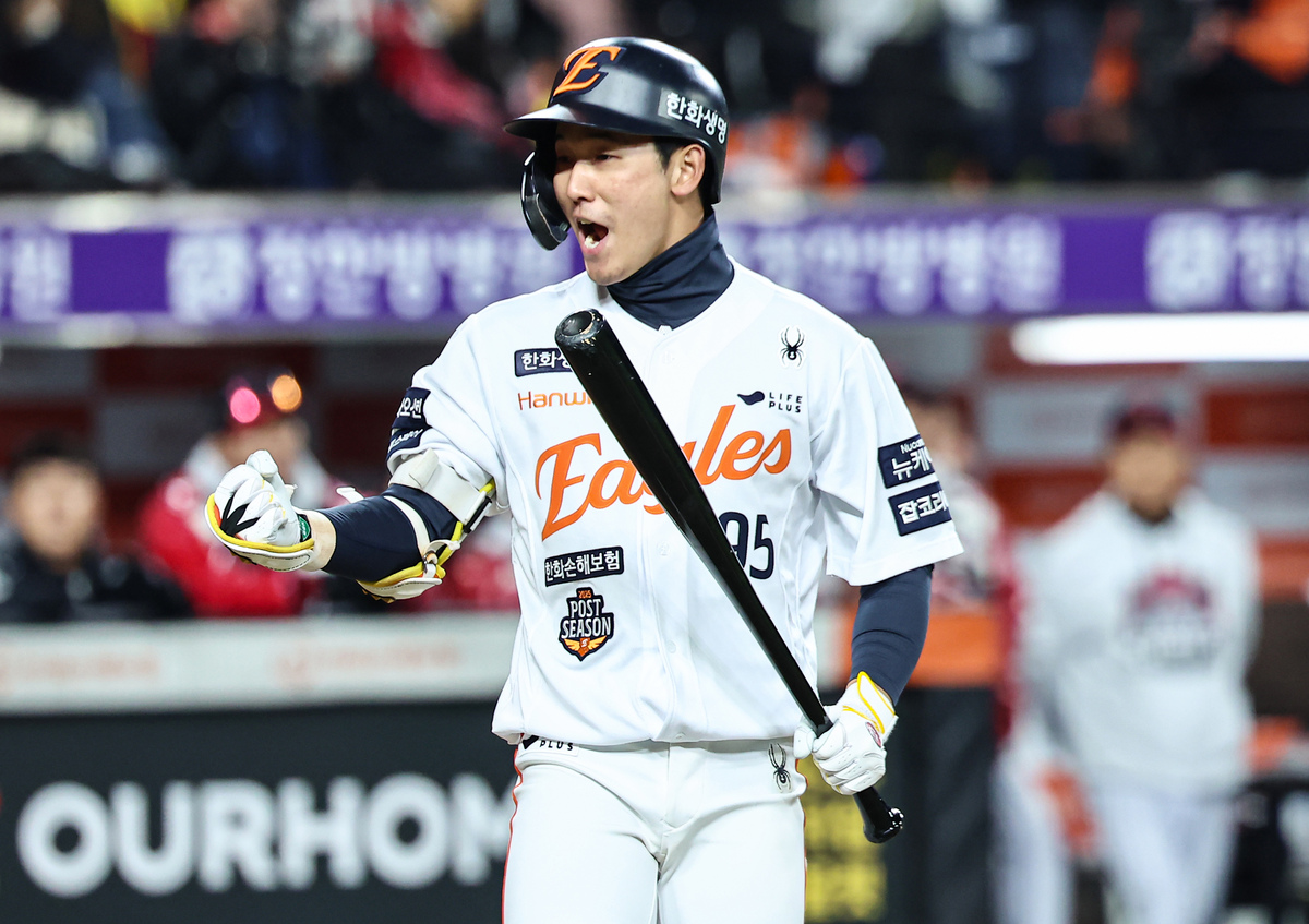 29일 대전 한화생명볼파크에서 열린 프로야구 2025 신한 SOL뱅크 KBO 포스트시즌 한국시리즈 3차전 LG 트윈스와 한화 이글스의 경기, 8회말 2사 만루상황에서 한화 황영묵이 밀어내기 볼넷을 얻고 동점이 되자 환호하고 있다. 뉴스1 유영찬은 4번 타자 노시환을 4구 만에 헛스윙 삼진으로 돌려세우며 한숨 돌렸다. 그러나 이후 유영찬의 제구가 흔들렸다. 채은성을 스트레이트 볼넷으로 내보내며 2사 만루에 몰리더니 대타 황영묵을 상대로도 제구가 흔들리며 결국 밀어내기 볼넷을 내주며 3-3 동점이 됐다.