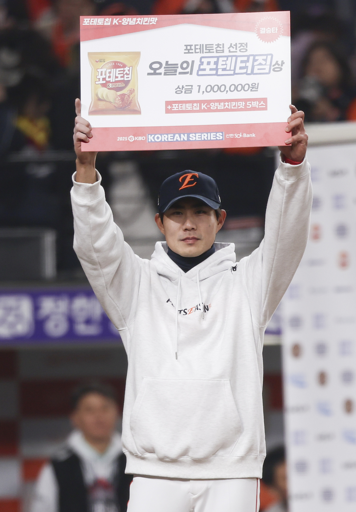 29일 대전 중구 한화생명볼파크에서 열린 2025 KBO 한국시리즈 3차전 LG 트윈스와 한화 이글스의 경기에서 한화이글스가 7-3으로 승리를 거뒀다. 한화 심우준이 포텐터짐상을 수상하고 기념촬영하고 있다. 뉴시스 그러나 심우준이 모처럼 몸값을 했다. 비결은 역시 빗맞은 안타였다. 1B-1S에서 유영찬의 151km짜리 몸쪽 직구를 잡아당겼다. 배트가 부러지며 빗맞아 날아간 공은 3루수 뒤쪽의 사각지대에 떨어지며 2타점 적시 2루타가 됐다. 한화가 5-3으로 역전하는 순간이었다. 결국 LG 벤치는 유영찬을 내리고 김영우를 올렸지만, 타석의 최재훈이 밀어친 타구가 2타점 우전 적시타가 되면서 한화는 7-3까지 달아나며 승기를 굳혔다.