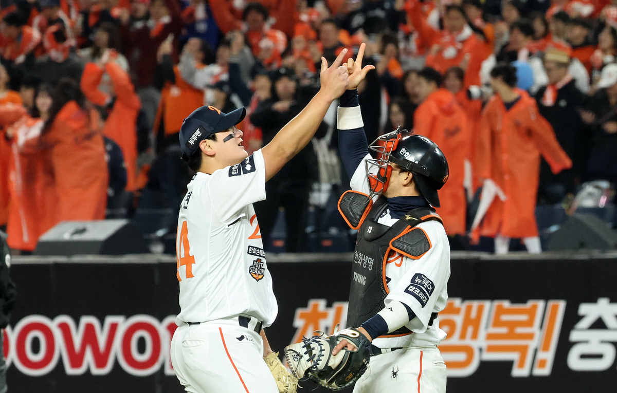 29일 대전한화생명볼파크에서 열린 2025 프로야구 KBO리그 포스트시즌 한국시리즈 3차전 LG 트윈스와 한화 이글스의 경기에서 승리한 한화 김서현과 최재훈이 기쁨을 나누고 있다. 연합뉴스