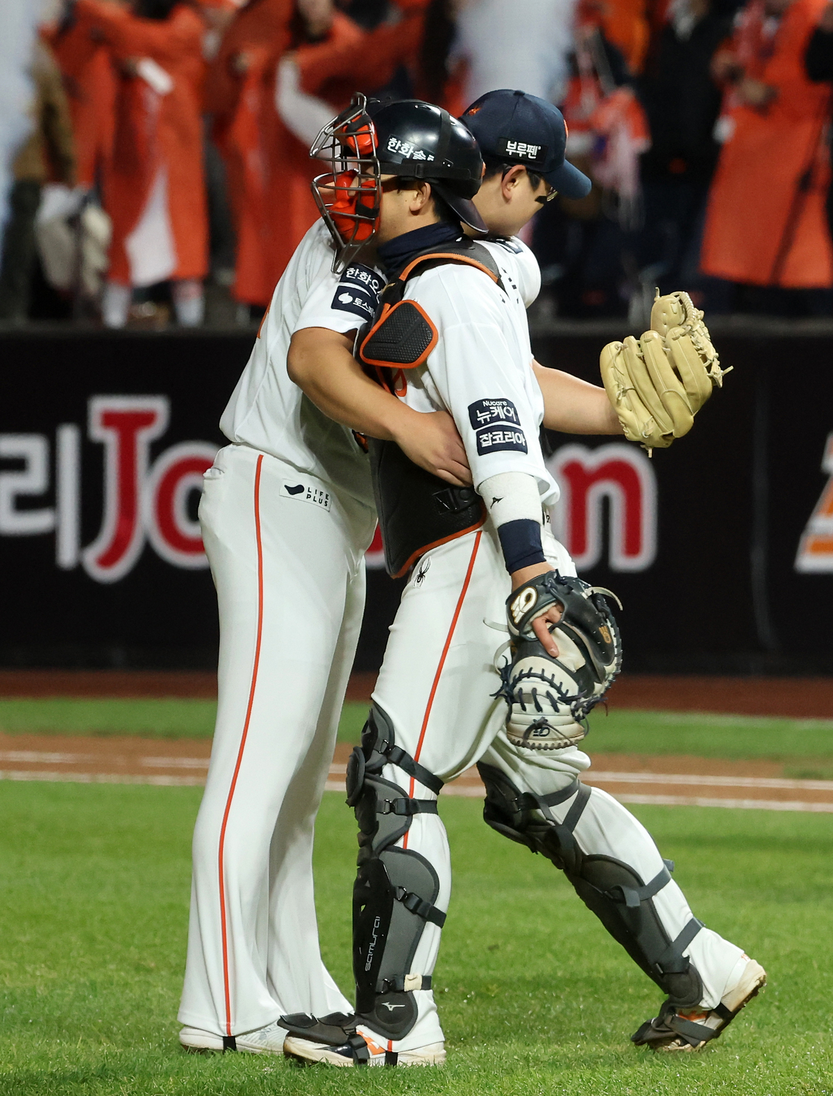 29일 대전한화생명볼파크에서 열린 2025 프로야구 KBO리그 포스트시즌 한국시리즈 3차전 LG 트윈스와 한화 이글스의 경기에서 승리한 한화 김서현과 최재훈이 포옹하고 있다. 연합뉴스