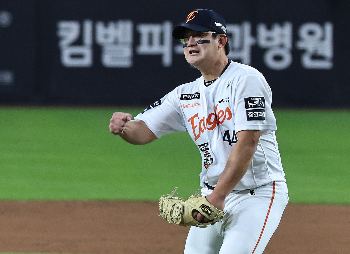 29일 대전 한화생명볼파크에서 열린 프로야구 2025 신한 SOL뱅크 KBO 포스트시즌 한국시리즈 3차전 LG 트윈스와 한화 이글스의 경기, 한화 김서현이 LG에 7대3 역전승을 거둔 뒤 포효하고 있다. 뉴스1