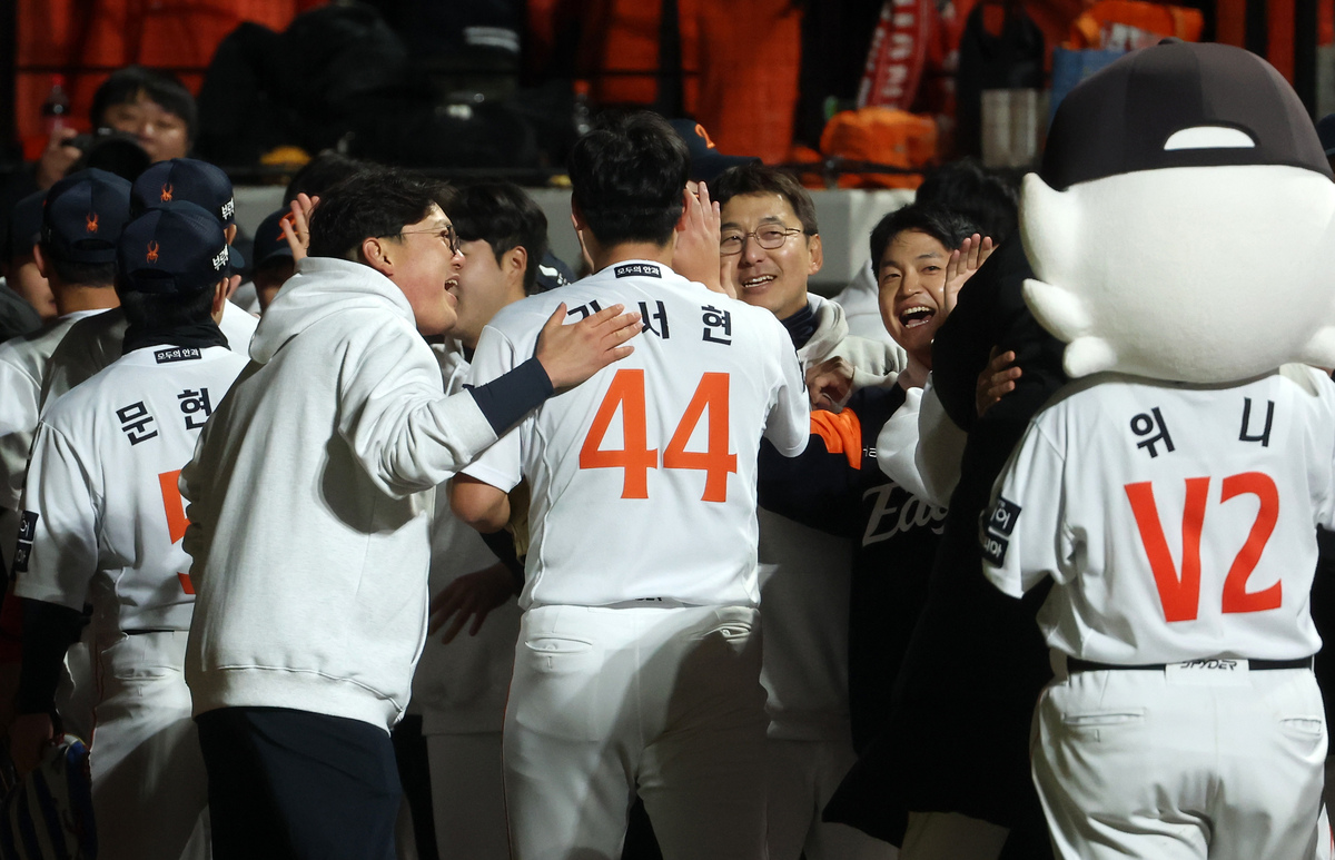 29일 대전한화생명볼파크에서 열린 2025 프로야구 KBO리그 포스트시즌 한국시리즈 3차전 LG 트윈스와 한화 이글스의 경기에서 승리한 한화 김서현이 동료들의 축하를 받고 있다. 연합뉴스 삼성과의 플레이오프는 그야말로 김서현에게 악몽같은 시간이었다. 1차전부터 그랬다. 한화가 9-6으로 앞선 9회에 세이브를 위해 마운드에 올랐으나 선두타자 이재현에게 솔로포를 맞는 등 0.1이닝 2실점으로 고개를 숙였고, 결국 경기 마무리는 김범수가 했다. 김서현이 흔들리자 한화 벤치의 마운드 운용이 크게 요동쳤다. 플레이오프 3차전엔 6회에 마운드에 올랐던 문동주가 9회까지 전부 책임진 게 가장 대표적인 장면이었다. 당시 승리 후 하이파이브하는 과정에 김서현의 깨름칙한 표정을 두고 한화팬들의 질타가 이어지기도 했다.