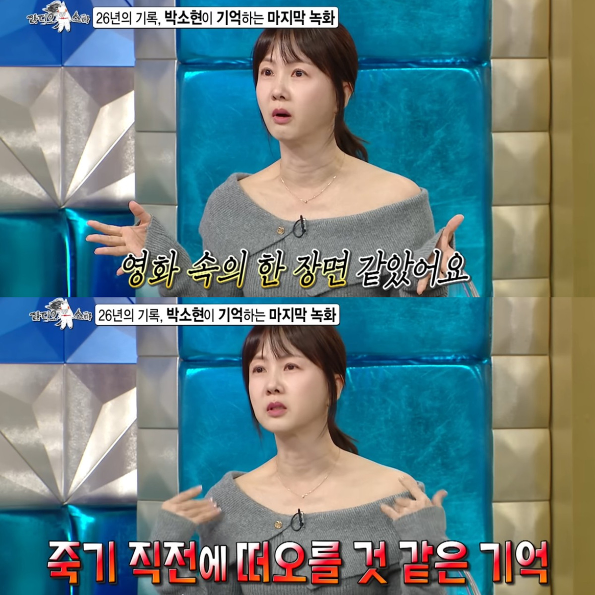 '세상에 이런 일이'의 마지막 녹화 당시. 유튜브 채널 '라디오스타' 영상 캡처 이에 박소현은 “‘여기서 나까지 울면 안 되겠다’고 생각해 이를 악물고 눈물을 참으며 프로그램을 잘 마무리했다”고 말했다. 박소현이 임성훈 아나운서에게 감사의 말을 전하던 그 때, ‘라디오스타’에서는 ‘세상에 이런 일이’의 마지막 녹화 현장 영상이 공개되기도 했다. 당시에는 눈물을 참으며 프로그램을 잘 마무리해야겠다는 생각에 담담한 모습을 보이던 박소현은 공개된 영상을 보고 끝내 참았던 눈물을 터트리며 “저 때는 제정신이 아니었다”라면서 “방송에서는 안 울었는데 녹화가 끝나고 나서야 눈물이 막 쏟아졌다”고 심경을 전했다.