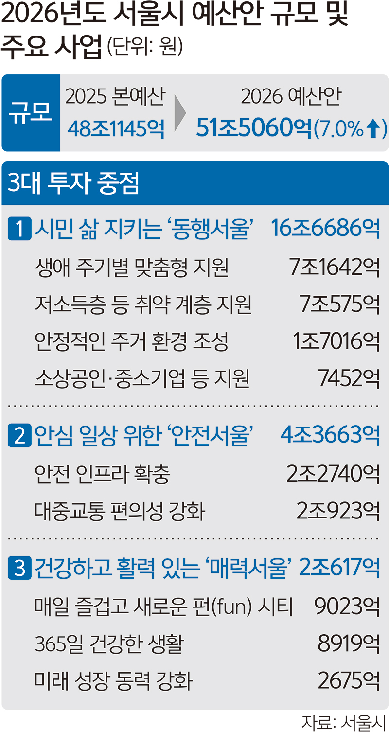 서울시청 청사 전경. 뉴시스 시는 31일 서울시의회에 이 같은 2026년도 예산안을 제출한다고 30일 밝혔다. 올해 본예산(48조1145억원)보다 7.0% 늘어 역대 최대 기록을 또다시 경신했다. 시교육청과 25개 자치구 지원 예산 등을 뺀 정책 사업비는 전년 대비 5.7% 증가한 28조7683억원이다. 우선 ‘시민의 삶을 지키는 동행서울’에 가장 많은 16조6686억원이 투입된다. 이 중 15조6256억원이 4대 급여(생계·의료·교육·주거), 저소득층 급식 지원 등 약자와의 동행 사업에 쓰인다. 공공 일자리엔 2조5641억원을 들여 역대 최대 규모인 22만5234개를 운영한다.