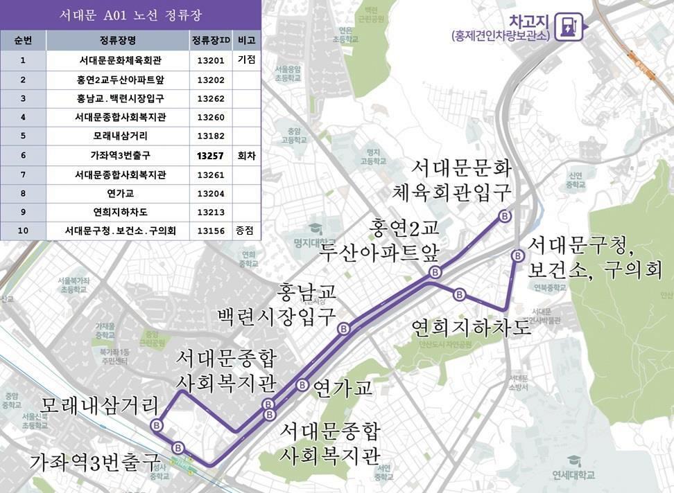 1일 구에 따르면 15일부터 운행을 시작한 서대문A01은 문화체육회관을 출발해 서대문구청 앞 정류소로 돌아오는 5.9km노선을 다닌다. 버스는 문화체육회관과 홍연2교 두산아파트 앞, 홍남교 백련시장입구, 서대문종합사회복지관, 모래내삼거리, 가좌역 3번출구, 서대문종합사회복지관, 연가교, 연희지하차도, 서대문구청 10개 정류소에 정차한다.