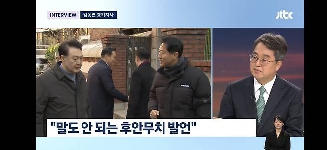 김 지사는 2일 밤 JTBC ‘뉴스룸’에 출연해 이처럼 각기 다른 판단을 내놨다. 그는 투자유치와 국제협력 강화를 위해 미국을 방문하고 전날 귀국했다.