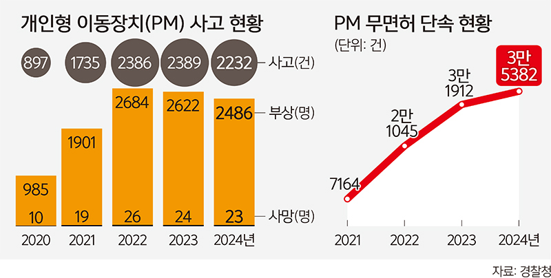 이처럼 ‘킥라니(킥보드+고라니)’ 사고가 잇따르자 지방자치단체들이 자체 규제에 나서고 있다. 3일 경찰청에 따르면 지난해 전동 킥보드 등 개인형 이동장치(PM) 교통사고는 2232건에 달한다. 사고로 숨진 이는 23명, 부상은 2486명이다. 특히 청소년의 PM 무면허 운전이 지난해에만 1만9513건으로 전체 55.1%를 차지했다.