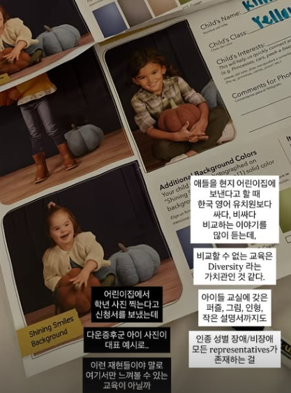 사진은 어린이집에 제출하는 학년 사진 신청서 관련 매뉴얼로 김수민은 매뉴얼 속 다운증후군 아이가 대표 예시로 제시된 부분을 촬영했다.
