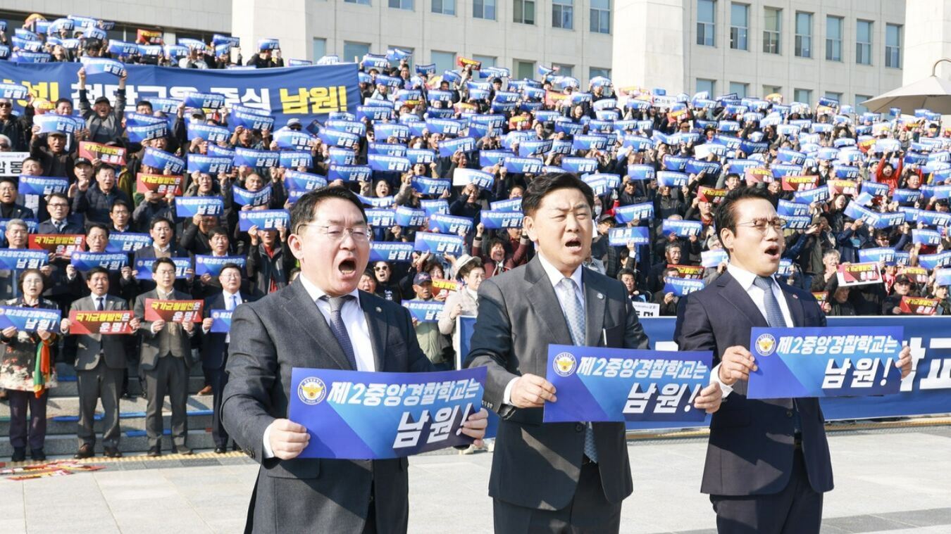 4일 서울 국회의사당 앞에서 열린 제2중앙경찰학교 남원 설립 촉구 결의 행사에서 김관영 전북도지사(가운데)와 최경식 남원시장(오른쪽), 박희승 국회의원이 2000여명의 참석자들과 함께 남원 유치를 요구하는 구호를 외치고 있다. 전북도 제공 2부 결의대회에서는 영호남 도민 대표들이 경찰 교육기관의 충청권 집중 해소와 남원의 내륙 중심 입지, 국가 균형발전 실현 필요성 등을 담은 결의문을 낭독했다. 남원시가 제시한 제2중앙경찰학교 후보지는 운봉읍 일원 166만㎡ 규모의 국공유지로, 평탄한 지형과 도심 인접성, 교통 접근성 면에서 최적지로 평가된다. 광주~대구, 순천~완주 고속도로와 KTX 남원역, 향후 개통 예정인 달빛고속철도 등 전국 주요 도시에서 접근이 용이하다.