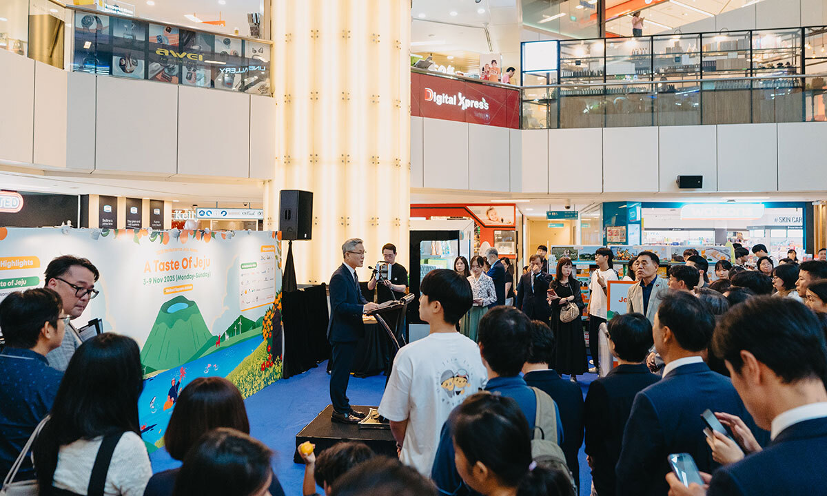 4일 싱가포르 노비나 유나이티드 스퀘어 아트리움에서 제주상품 팝업스토어 ‘테이스트 오브 제주(A Taste of Jeju)’가 열리고 있다. 제주도 제공 진명기 제주도 행정부지사는 “제주는 청정과 지속가능성을 중심으로 한 혁신과 도전의 섬으로, 이번 행사를 계기로 제주 기업들이 싱가포르를 비롯한 아세안 시장에서 새로운 기회를 만들어가길 기대한다”며 “제주산 한우·돼지고기의 싱가포르 수출 합의가 이뤄졌듯이 양국 간 교류가 경제와 문화의 상생 발전으로 이어지길 바란다”고 밝혔다. 김민 주싱가포르 대사관 공사는 “한·싱 수교 50주년을 맞은 올해 제주산 한우와 돼지고기의 싱가포르 수출이 성사된 것은 양국 협력의 상징적인 성과”라며 “이번 제주의 날을 계기로 청정 제주 브랜드가 싱가포르 시민들에게 더욱 사랑받기를 기대한다”고 말했다.