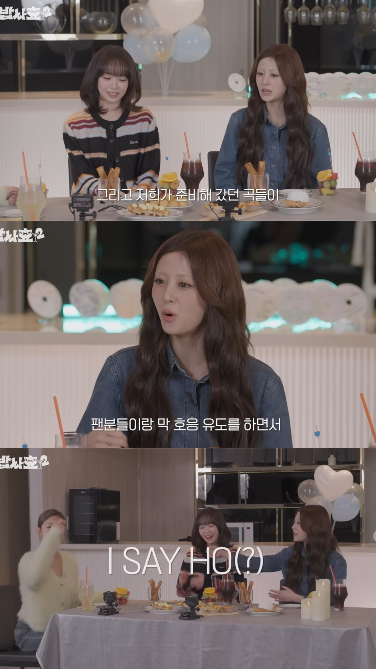다 함께 부르는 노래이지만, 호응을 유도하기 애매했던 현장의 분위기. 유튜브 채널 '효연의 레벨업 Hyo's Level Up' 영상 캡처 허윤진은 “저희가 준비해 간 곡들이 팬분들이랑 막 호응 유도를 하면서 같이 (무대를) 하는 곡들이었다”라면서 “그런데 거기서 대통령님께 마이크를 넘기며 'I SAY HO!', 'YOU SAY HA!' 하기엔 굉장히 애매했다”고 말했다. “마이크를 쥐고 ‘이걸 해 말아’라고 고민하면서 저희끼리 그냥 신나게 무대를 했는데, 사실은 굉장히 떨렸다”고 심경을 밝혔다.