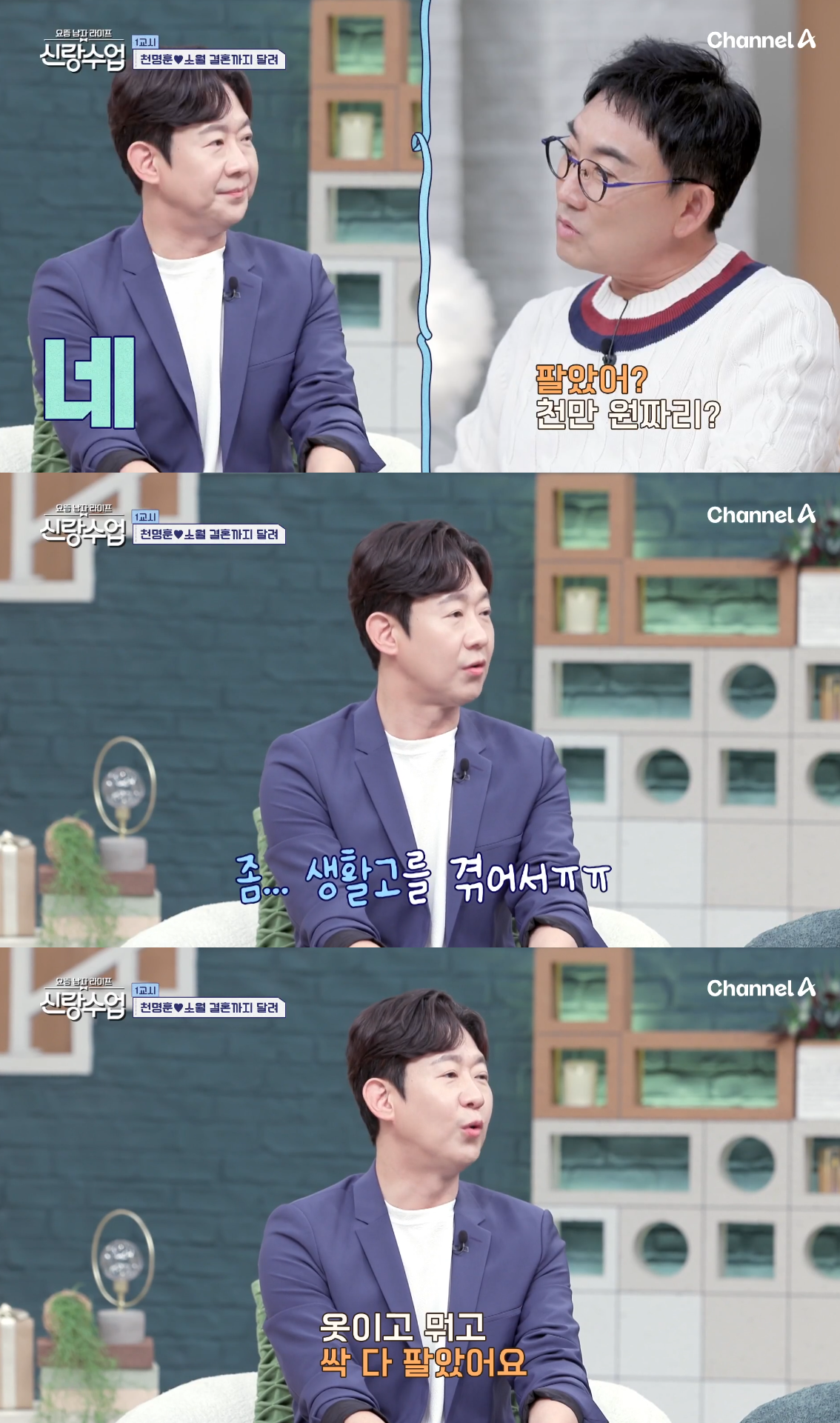 채널A ‘요즘 남자 라이프-신랑수업’ 방송화면 캡처 스튜디오에서 이를 지켜보던 이승철은 “1000만원짜리 자전거를 팔았냐”며 놀라워했고, 천명훈은 “팔았다. 생활고를 겪어서 옷이고 뭐고 싹 다 팔았다”며 “(요즘은 상황이) 좀 회복되고 있다”고 털어놨다.