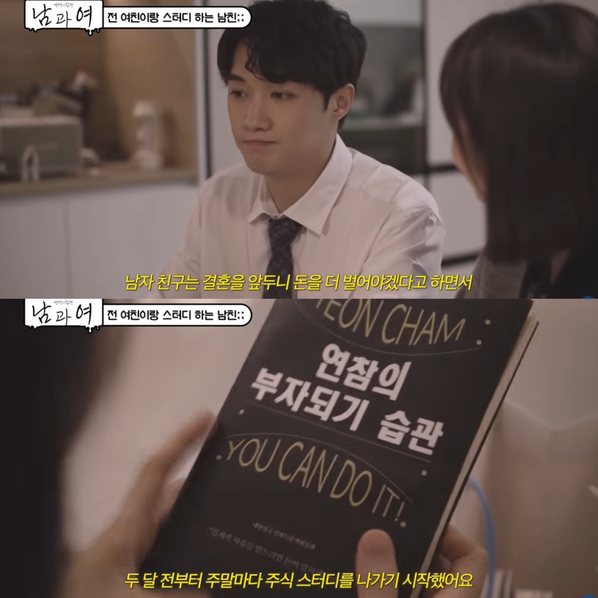 전 여자친구와 단둘이 주식 스터디를 하는 남자친구에 대한 사연이 공개됐다. 유튜브 채널 'KBS Joy' 영상 캡처 ‘결혼 전 돈을 모은다’는 핑계로 전 여자친구와 단둘이 주식 스터디를 하는 남자친구에 대한 사연이 공개됐다. 지난 5일 공개된 ‘연애의 참견 남과 여’에서는 산부인과 전문의 이유미 원장과 최서임 아나운서가 게스트로 출연해 목소리 연기를 더했다.
