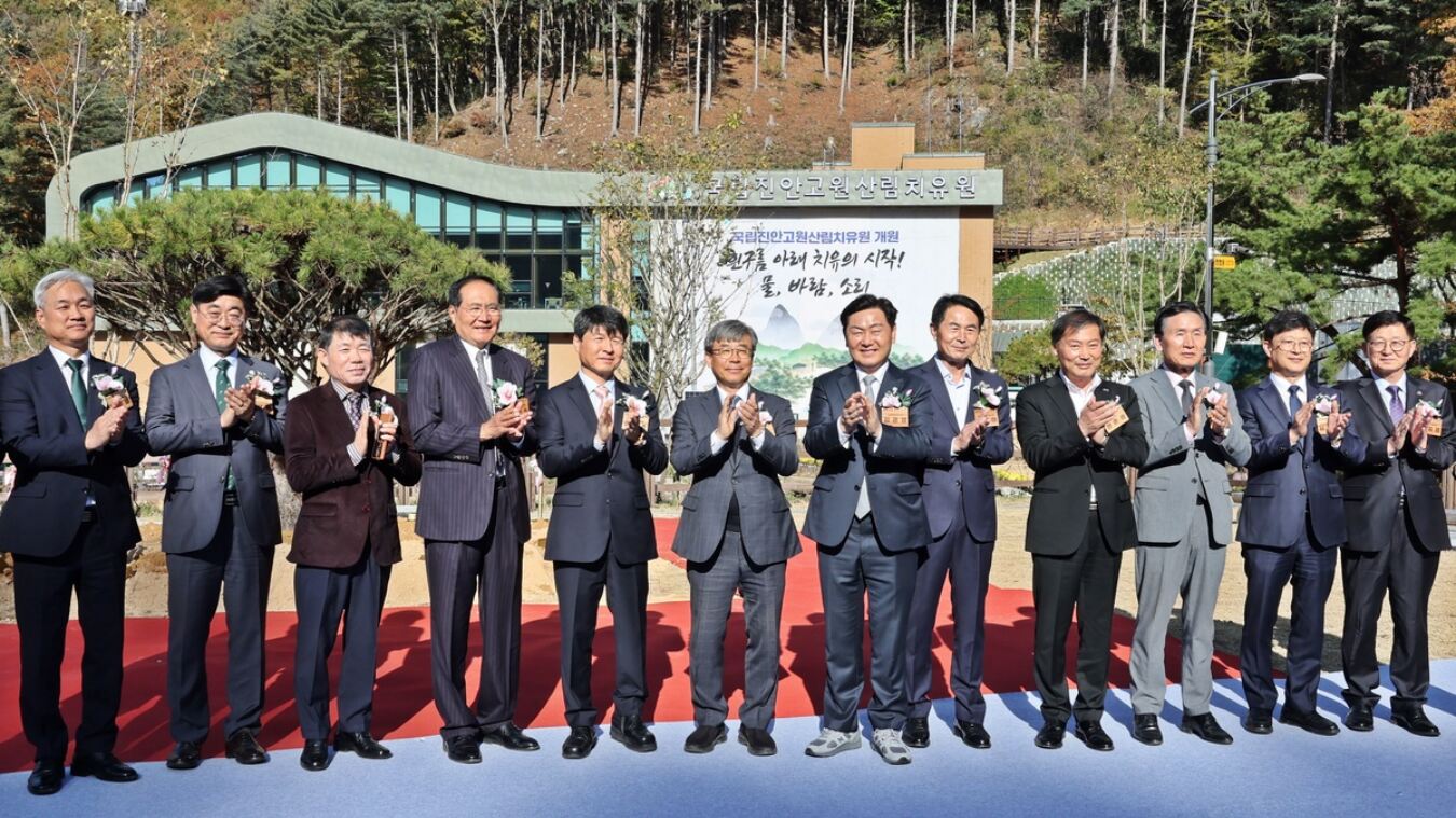 6일 전북 진안군 백운동 계곡에서 열린 ‘국립진안고원산림치유원’ 개원식에서 주요 인사들이 박수로 축하하고 있다. 전북도 제공 산림청과 한국산림복지진흥원은 이번 개원을 계기로 산림치유 서비스의 공공 접근성을 확대하고 지역 단위 복지·관광 융합 모델을 확산할 계획이다. 전북도 또한 데미샘자연휴양림과 고원화목원, 와룡자연휴양림 등과 연계해 체류형 산림 관광벨트를 조성하고, 지역 특산물과 치유음식, 산림치유 꾸러미 상품 개발을 통한 일자리 창출에 나선다. 김관영 전북도지사는 “국립진안고원산림치유원이 국민에게는 건강과 희망을 선물하는 숲이자, 도민에게 새로운 활력을 불어넣는 상생의 장이 되길 바란다”고 말했다.