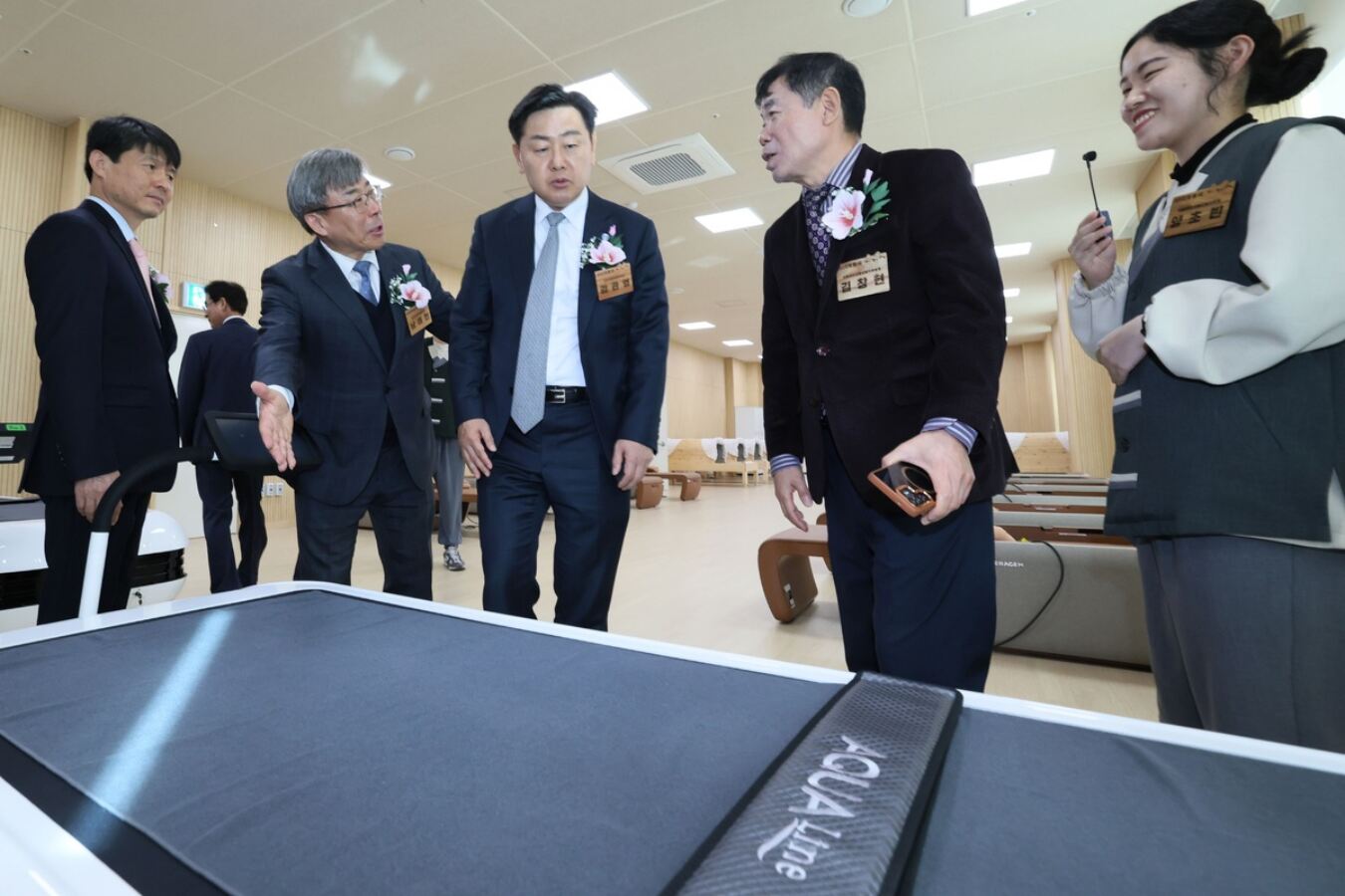 6일 전북 진안군 백운동에 개원한 ‘국립진안고원산림치유원’에서 김관영 전북도지사(가운데) 등이 치유실 시설을 둘러보고 있다. 전북도 제공