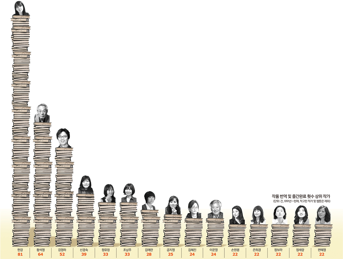 한국 작가의 노벨문학상 수상은 특성상 번역을 통해 세계 독자의 손에 닿아야 가능하다는 점에서, 무엇보다 양질의 작품 번역이 중요하다. 한강 작가의 경우 지난해 노벨문학상 수상 전후 한국문학번역원의 지원을 받아 해외에서 작품이 번역 출간된 건수는 모두 81건으로, 다른 작가들을 압도했다.