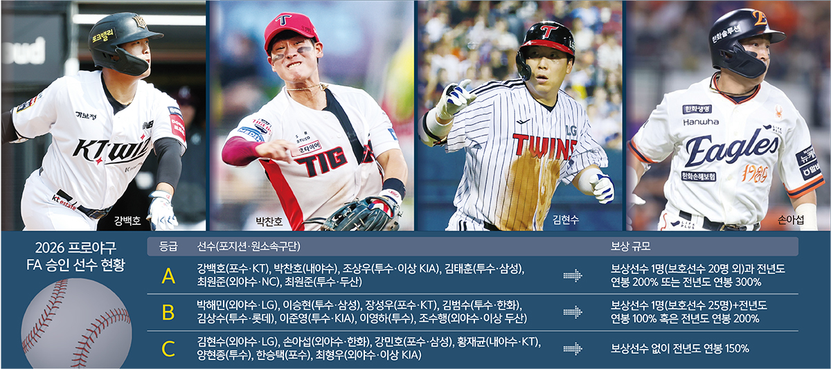 프로야구 ‘단장의 시간’인 스토브리그의 꽃이자 엄청난 돈잔치가 펼쳐지는 자유계약선수(FA) 시장이 9일 드디어 개장했다. KBO가 지난 5일 FA 자격 공시한 30명 가운데 9명이 은퇴나 신청을 포기하며 21명의 선수가 FA가 돼 자신의 가치를 평가받는다. 강백호(KT), 박찬호, 조상우(이상 KIA), 투수 김태훈(삼성), 외야수 최원준(NC), 투수 최원준(두산·이상 원소속팀)은 A등급으로, 이 선수들을 영입한 팀은 보상선수 1명(보호선수 20명 외)과 전년도 연봉 200% 또는 전년도 연봉 300%를 원소속팀에 지급해야 한다. 박해민(LG), 우완 투수 이승현(삼성), 장성우(KT), 김범수(한화), 김상수(롯데), 이준영(KIA), 이영하, 조수행(이상 두산)은 B등급, 김현수(LG), 손아섭(한화), 강민호(삼성), 황재균(KT), 양현종, 한승택, 최형우(이상 KIA)는 C등급이다. B등급 보상 규모는 보상선수 1명(보호선수 25명)+전년도 연봉 100% 혹은 전년도 연봉 200%, C등급은 보상선수 없이 전년도 연봉 150%다. 각 구단은 3명의 외부 FA까지 영입할 수 있다.