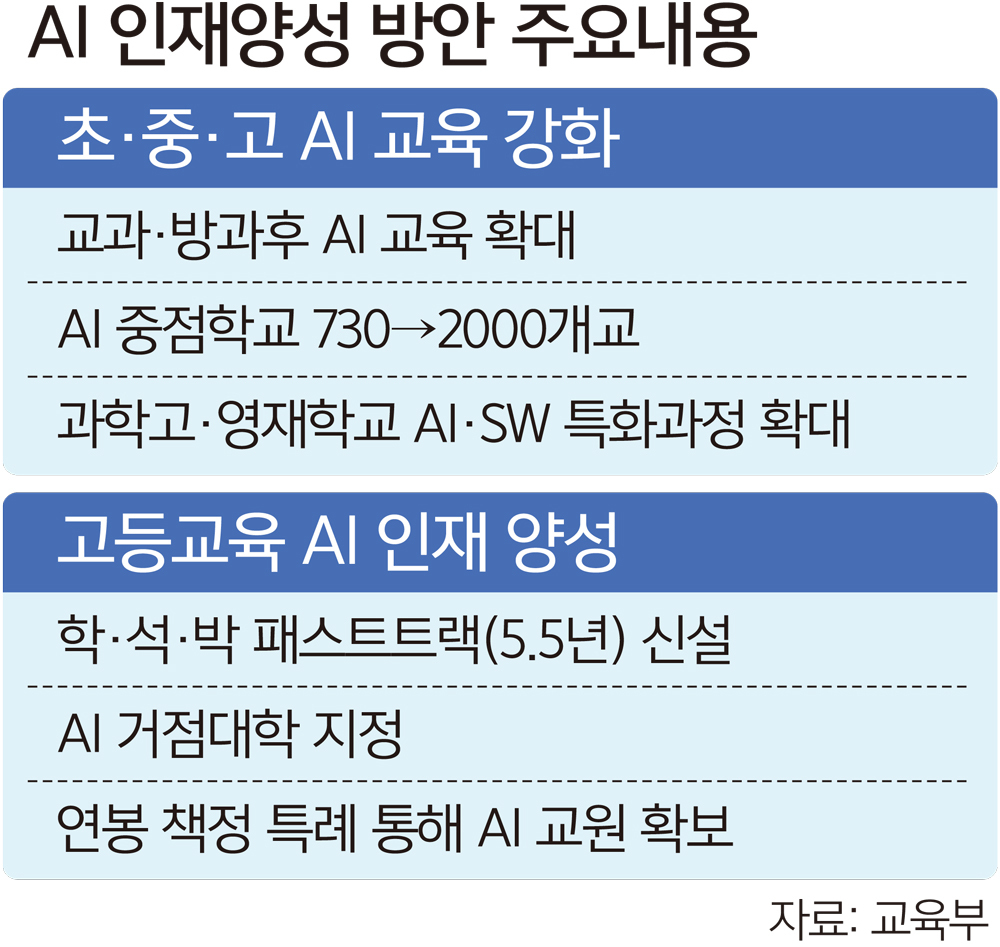 원활한 AI 교육을 위해 예비 교원 대상 AI 교육을 강화하고, 정보 담당 교원도 늘린다. 또 AI 인재를 조기 육성하고자 과학고·영재학교의 AI·소프트웨어(SW) 특화 교육, AI 인재 선발도 확대한다.