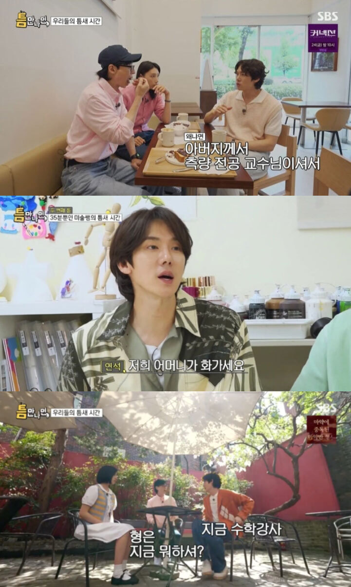 SBS 예능 ‘틈만나면’ 방송 화면 캡처 또 5월 7일 방송에서 형제, 자매에 대한 이야기를 나누던 중 유연석이 “형 하나 있는데 진짜 많이 싸우다가 어른 되고 가까워졌다”고 밝혔다. 이에 유재석이 “형은 지금 뭐 하시냐”라고 묻자 그는 “지금 수학 강사다. 온라인으로 강의한다”고 설명했다. ‘형이 1타 강사냐’는 질문에는 “한... 3타 정도”라고 재치 있게 받아쳐 웃음을 안겼다. 이에 앞서 2023년 2월 JTBC 드라마 ‘사랑의 이해’ 종영 인터뷰에서도 그는 가족과 성장 환경에 대해 이야기했다. 당시 유연석은 ‘엄친아’ 이미지와 관련해 “아버지가 경상대학교 교수셨다. 국립대 교수니까 (극 중 캐릭터처럼) 사업하는 집안과는 차이가 있다. 고등학교 때 강남 한복판 경기고에 전학을 갔는데 아버지는 지방에 있어야 했다. (가족이) 두 집 살림하는 게 녹록지는 않았다. 당시에 40년 된 아파트에 살았다”고 밝혔다.