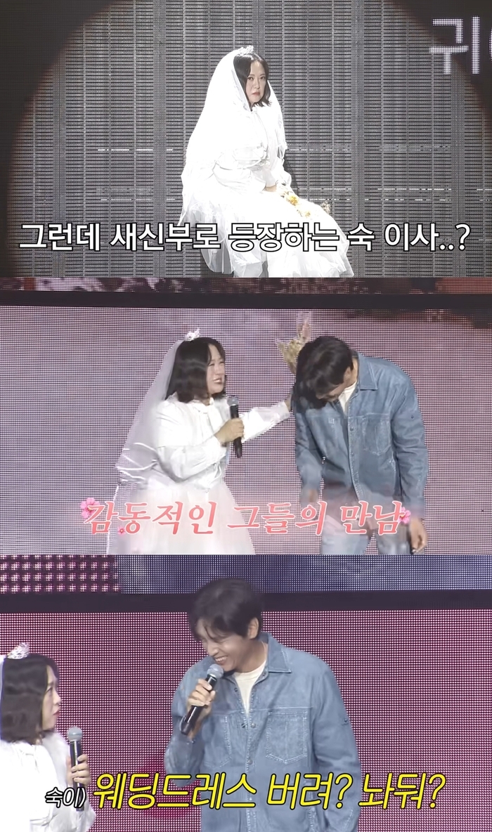 유튜브 '비보TV' 김숙은 웨딩드레스를 입고 무대에 먼저 등장했고 "그(구본승)가 분명히 온다고 했어"라며 기대감을 내비쳤는데, 이에 송은이는 "아냐 그는 오지 않을거야"라고 반박했다. 하지만 이후 구본승이 무대에 등장했고 이를 본 김숙은 달려가 구본승의 품에 안기며 팬들의 환호를 자아냈다.