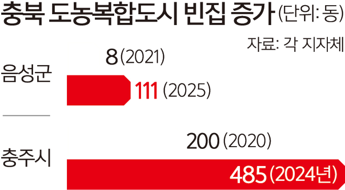 11일 음성군에 따르면 2021년 58동이던 빈집은 지난 9월 111동으로 두 배 가까이 늘었다. 이 기간 음성읍은 10동에서 45동으로, 금왕읍은 13동에서 30동으로 급증했지만 맹동면은 14동에서 10동으로 증가 폭이 크지 않다. 같은 기간 인구는 음성읍 1만6669명에서 1만5829명으로 5.0%(840명), 금왕읍 1만9556명에서 1만8613명으로 4.8%(943명) 감소했다. 맹동면(1만3094명에서 1만3064명)은 인구 변화가 거의 없다. 맹동면은 충북혁신도시와 옛 면소재지가 혼재해 있다.
