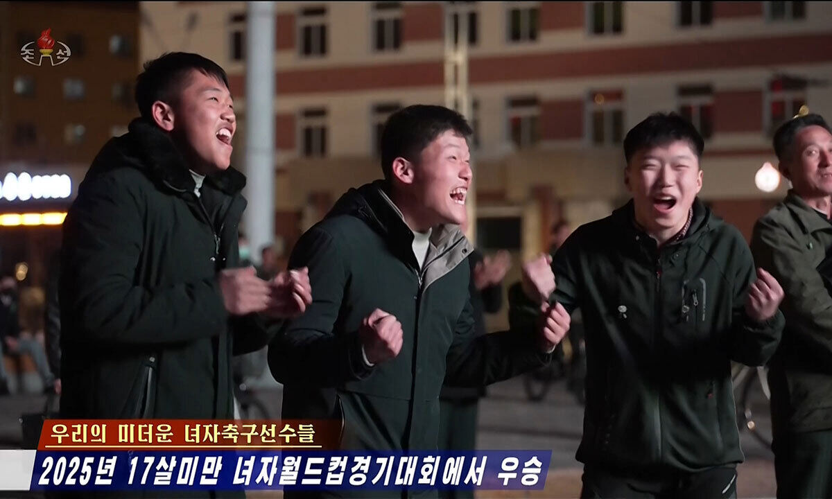 북한 주민들이 시내 대형전광판과 TV로 9일 모로코 라바트에서 열린 2025 국제축구연맹(FIFA) U-17 여자월드컵 결승전을 시청하며 환호하고 있다. 조선중앙TV·연합뉴스 북한 대표팀은 지난 9일 모로코 라바트에서 열린 2025 결승전에서 네덜란드를 상대로 3-0으로 이기며 우승컵을 거머쥐었다. 경기가 완승으로 끝나자 조선중앙TV는 다음날인 10일 녹화중계를 내보냈다. 거리응원에 나선 평양 시민들의 모습은 11일 방송됐다. 평양역 대형 전광판 앞에 모인 시민들은 북한 국기인 인공기를 흔들며 환호성을 질렀다. 한 운전자는 갓길에 차를 세우고 경기 화면을 봤다.