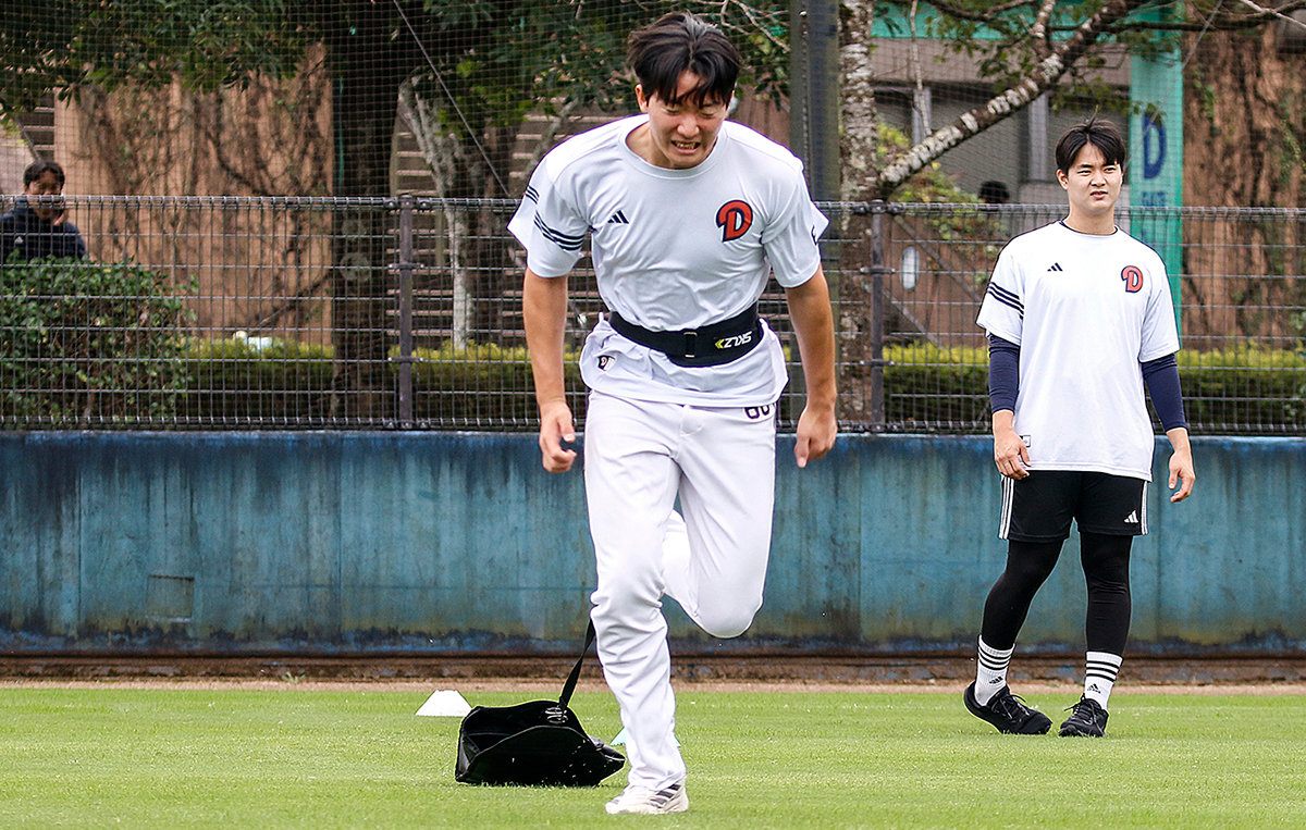김원형 감독이 새로 부임한 두산 캠프도 선수들의 거친 숨소리가 끊이지 않고 있다. 두산 강훈련을 상징하는 것이 ‘디펜스 데이’다. 내야수들은 하루에 1명씩 오후 내내 온전히 수비 훈련만 하는 날을 갖는다. 300개 남짓의 무한 펑고를 몸을 날리며 받아내다 보면 유니폼은 금세 흙투성이가 된다. 박지훈은 “5분 만에 다리가 움직이지 않았지만, 정신력으로 버텼다. 온몸이 뭉쳤지만, 성장통이라고 생각한다”며 의연한 자세를 보였다. 투수들도 15㎏ 흙주머니를 끌고 50m 전력질주를 5차례 이상 반복한다. 하체를 중심으로 몸 전체의 힘을 기르는 데 효과가 좋다는 것이 구단의 설명이다.