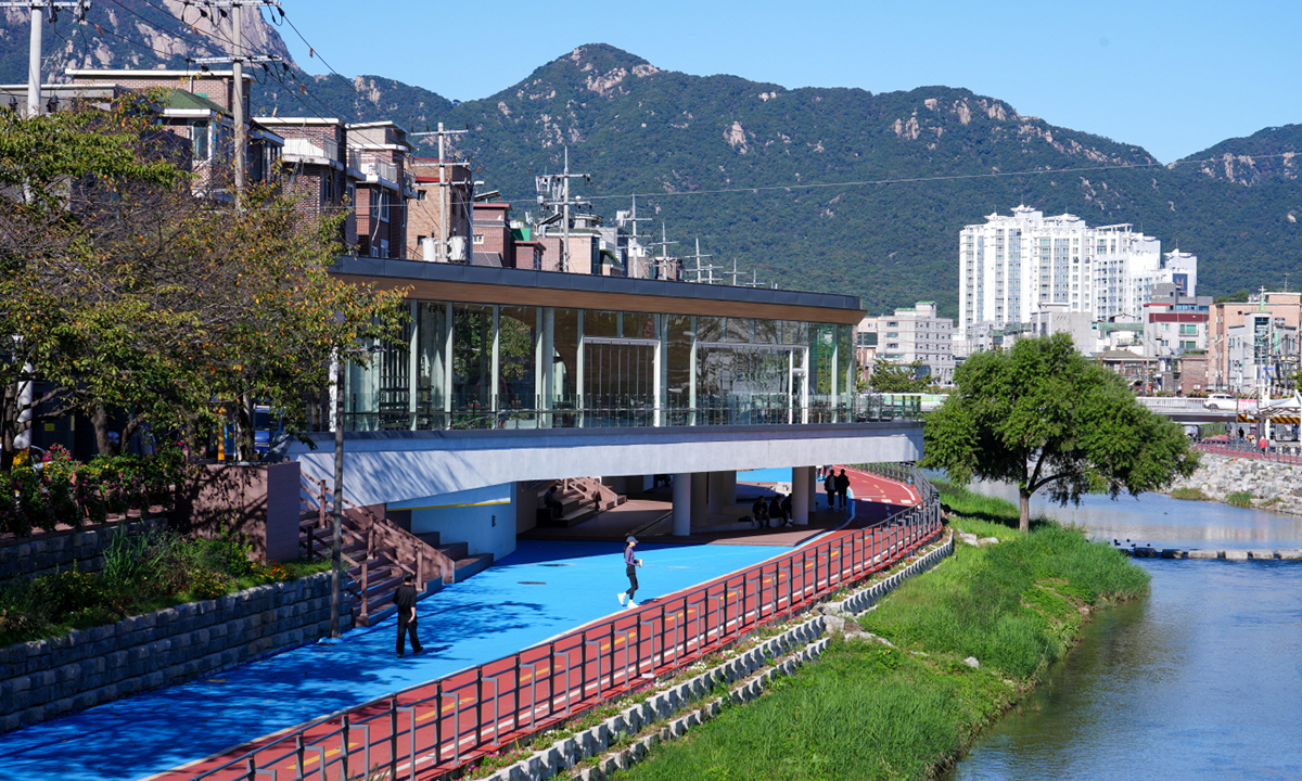 서울 강북구에 위치한 ‘재간정’ 외부 전경. 강북구 제공 건물은 우이천의 물길을 따라 곡선을 살린 설계로 주변과 어우러지는 모습으로 만들어졌다. 통창을 통해 우이천변을 감상하는 데 용이하도록 설계됐다. 내부에는 LP를 통해 아날로그 음악을 감상할 수 있는 음악존과 독서와 휴식을 위한 열람공간이 마련돼 있다.
