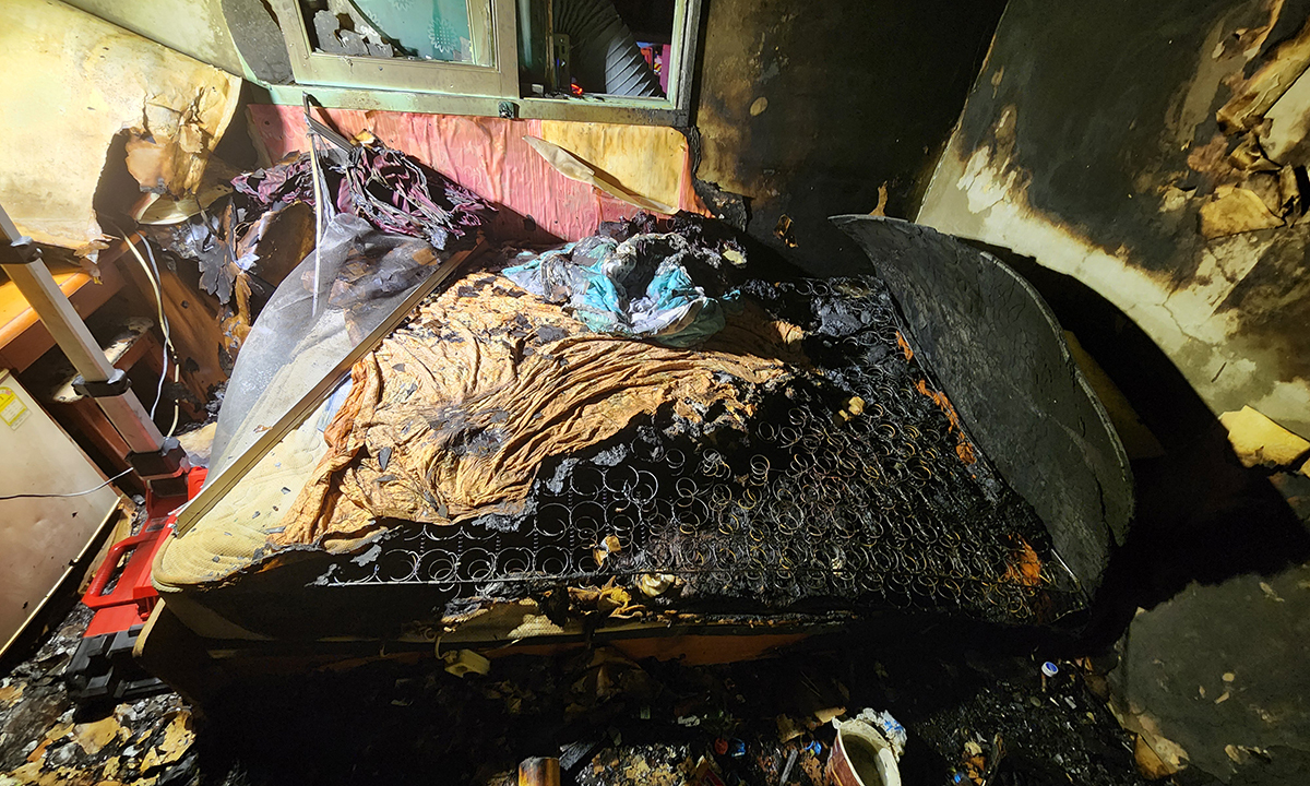 부산 북구의 한 여관에서 발생한 불로 여관 실내가 까맣게 탔다. 부산소방재난본부 제공 이 불로 해당 여관 2층에 투숙했던 50대 남성 A씨가 온몸에 화상을 입은 채 발견돼 병원으로 옮겨졌으나, 숨졌다. 다른 투숙객 10여명도 긴급 대피했고, 불은 출동한 소방대원에 의해 40여분 만인 이날 오전 5시쯤 진화됐다. 경찰과 소방당국은 이날 오전 합동감식을 통해 정확한 화재원인을 조사할 예정이다.