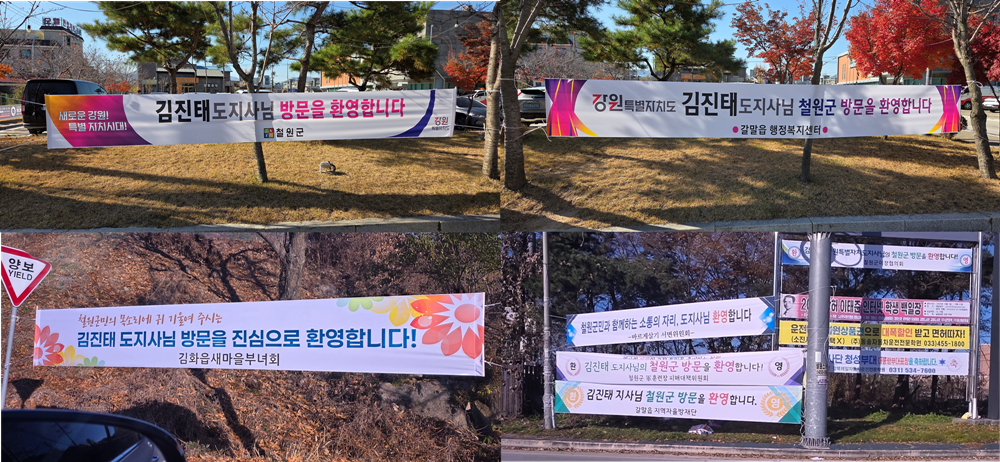 철원군 곳곳에 김진태 강원도지사 방문을 환영하는 현수막이 내걸려 있다. 강원도 제공 이현종 철원군수는 환영사를 통해 김 지사가 그간 철원을 위해서 노력한 점, 이뤄낸 성과 등을 설명했다. 이 군수는 특히 “군사 규제 100만평 완화와 함께 해제하기 어렵다는 농업진흥지역까지 3만4000평을 과감하게 풀어주셨다”고 감사를 전했다. 이어 “도비 60~70억원을 지원받아 수돗물 하수처리시설 개선을 추진하고 있고, 신철원과 와수 지역은 그간 여건상 시행하지 못한 LPG 배관망 사업을 본격 추진할 예정”이라며 “철원을 아끼고 주민 애로사항을 신속하게 해결하고자하는 지사님의 마음에 감사하다”고 덧붙였다.