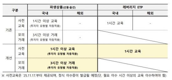 또한 해외 레버리지 상장지수상품(ETP)의 경우 사전교육 1시간만 의무화된다. 레버리지 ETP의 경우 일반 주식처럼 거래되고 원금 초과 손실 위험은 없다는 점을 고려한 조치다.