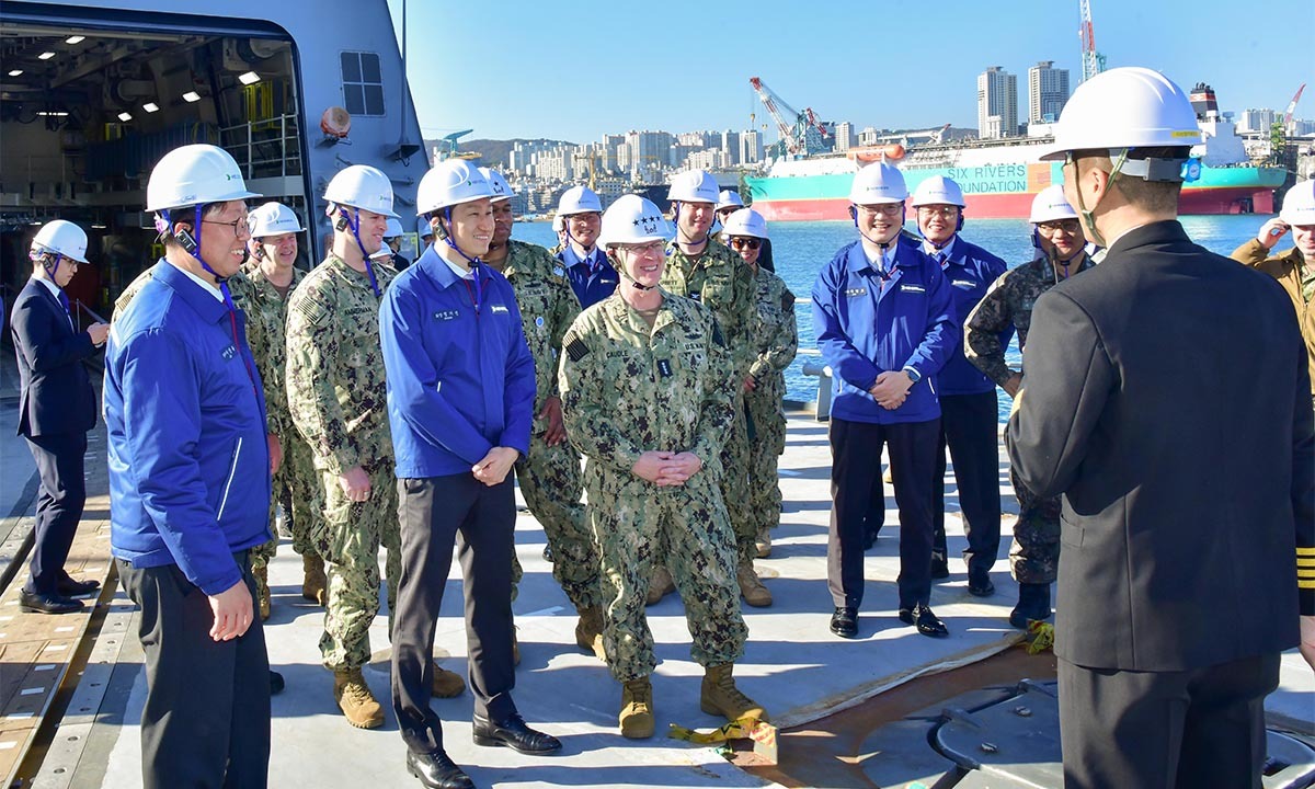 美 해군총장, 마스가의 심장 울산찾아 대릴 커들 미국 해군참모총장(앞줄 왼쪽에서 세 번째)이 지난 15일 HD현대중공업 울산 조선소에서 정기선 HD현대 회장(〃 두 번째) 등과 함께 야드를 둘러보며 건조 중인 함정에 대한 소개를 듣고 있다. HD현대 제공 ◆신속한 국내 건조, 쉽지 않아 위 실장은 핵잠 건조 일정에 대해 “목표 시기가 특정돼 있지 않지만 대개 (건조에) 10년 가까이 걸리는 것으로 알고 있다”며 “빨리 시작해서 시기를 앞당겨야 하지 않겠나”고 말했다. 속전속결 방식을 언급한 셈이다.