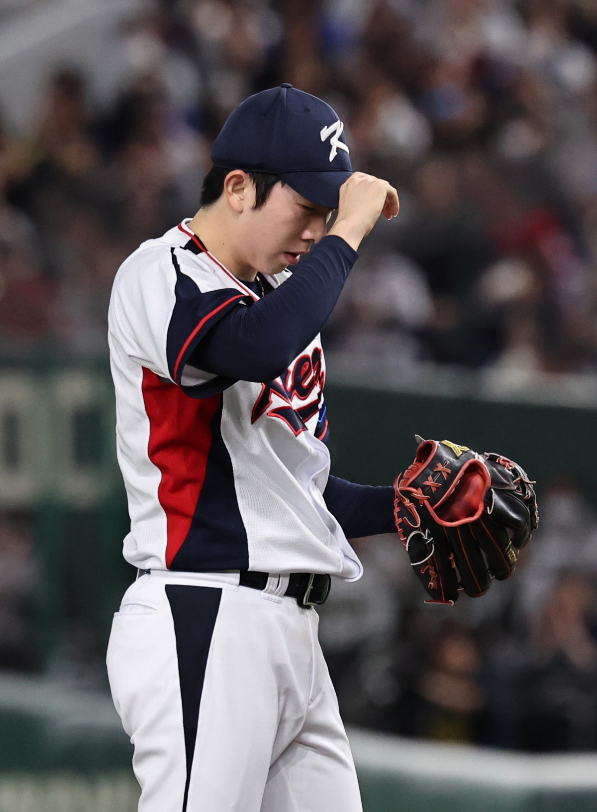 16일 일본 도쿄돔에서 열린 월드베이스볼클래식(WBC) 대비 평가전 '2025 케이 베이스볼 시리즈(K-BASEBALL SERIES)' 일본과의 2차전 경기. 4회초 일본에 2실점한 대한민국 투수 오원석이 땀을 닦고 있다. 뉴스1 한국 타선이 3회말 공격에서 3점을 뽑은 덕분에, 정우주는 3-0으로 앞선 4회초 시작과 동시에 오원석(KT)에게 마운드를 넘겼다. 그러나 오원석은 마운드에 오르자마자 2루타와 볼넷을 허용한 뒤 삼진으로 첫 아웃카운트를 잡아냈지만, 또 다시 볼넷을 내주며 1사 만루에 몰렸다. 사사키에게 적시타를 맞은 뒤 이소바타에게 밀어내기 볼넷까지 허용한 뒤 마운드를 내려갔다. 오원석의 부진은 정우주가 얼마나 강심장이었는지를 엿볼 수 있는 대목이었다. 남정훈 기자 che@segye.com