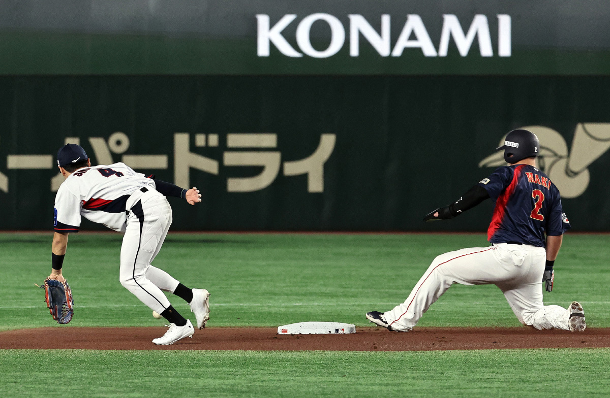 16일 일본 도쿄돔에서 열린 월드베이스볼클래식(WBC) 대비 평가전 '2025 케이 베이스볼 시리즈(K-BASEBALL SERIES)' 일본과의 2차전 경기. 2회초 무사 1루 일본 니시카와 땅볼때 대한민국 투수 정우주의 송구 실책으로 2루수 신민재가 공을 놓치며 1루 주자 마키에게 진루를 허용하고 있다. 뉴스1