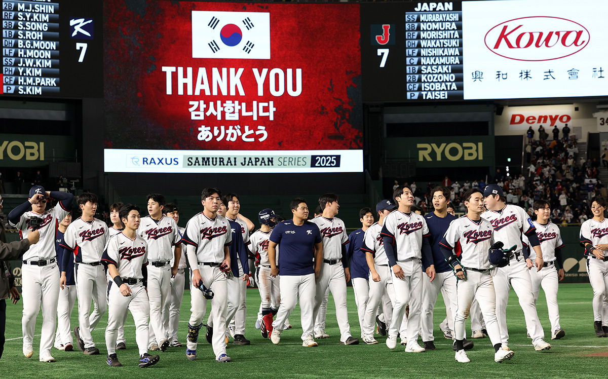 16일 일본 도쿄돔에서 열린 2025 K베이스볼 시리즈 대한민국과 일본의 평가전. 7-7 무승부를 기록한 대표팀 선수들이 팬들에게 인사한 뒤 경기장을 빠져나가고 있다. 연합뉴스 한국은 7회말 공격에서 1사 후 문보경, 문현빈의 연속 볼넷, 김주원의 몸에 맞는 공으로 만루 기회를 잡았고, 대타 박동원이 희생플라이를 치며 1점을 따라 붙었다. 일본은 곧바로 8회초 공격에서 또 밀어내기 득점을 뽑아내 점수 차를 2점으로 벌렸다. 5-7로 끌려가던 한국은 8회말 안현민, 9회말 김주원이 각각 솔로 홈런을 쳐내며 동점을 만드는 데 성공했다. 김주원은 마무리 투수 오타 다이세이의 3구째를 받아쳐 우중간 펜스를 훌쩍 넘는 동점포를 때려내며 극적인 무승부를 이끌었다.