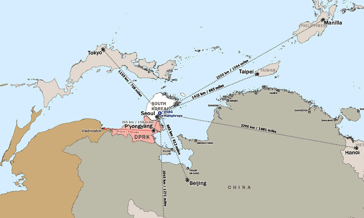 브런슨 사령관은 “한국의 역할은 자연스러운 전략적 중심축(pivot)이다. (주한미군이 주둔한) 캠프 험프리스는 평양에서 약 158마일(254㎞), 베이징에서 612마일(985㎞), 블라디보스토크에서 500마일(805㎞) 거리로서 잠재적 위협과 가깝다”며 한국에선 중국, 러시아의 해양활동을 견제할 수 있다고 밝혔다. 이어 “베이징의 관점에서 보면 전략적 가치는 더 분명해진다”며 주한미군 오산 공군기지를 “중국 주변에서 즉각 효과를 낼 수 있는 근접 전력”으로 평가했다.